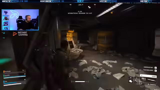 08:19:15Nachdem der Plan im Abfluggebäude gescheitert ist, versucht das Team, durchzulaufen, ist jedoch zu langsam. Die Stimmung ist frustriert. Man lootet, was man findet, darunter eine Kaffeekanne und Feuerbälle, doch die Zeit läuft ab. Der Auszug wird zur Hetzjagd, bei der man von mehreren Gegnern attackiert wird.