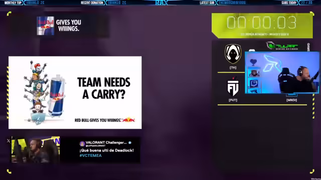 06:02:21Im Fokus des Streams steht die aktuelle Partie und der Agenten-Meta. Es wird die Map drei, Icebox, analysiert. Der Sprecher hebt hervor, dass Red Bull Clutch mit 4-2 führt und ein Tail sowie ein Breach von Heretics gezeigt wird. Er vertritt die Ansicht, dass Waylay für den Ranked-Modus schwierig ist, da das Team mitziehen muss. Die Nutzung von Breach und Waylay zusammen wird als starkes Lineup bewertet, um durch Placebo-Fakes und Lockdown-Wände zu dominieren.