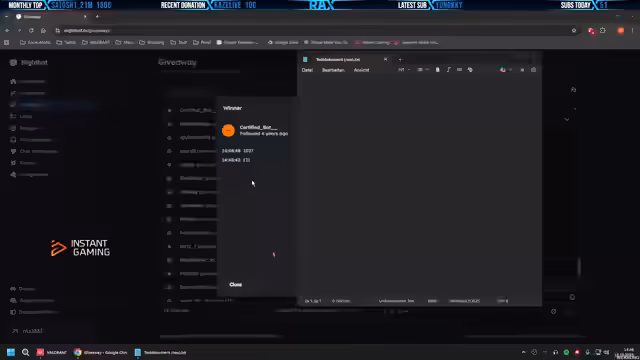 05:04:21Nach der Ziehung der zweiten 10-Euro-Gutschrift wird das Giveaway fortgesetzt, um die restliche Summe von 30 Euro zu verteilen. Hierbei kommt es zu technischen Unstimmigkeiten bei der Gewinnerüberprüfung. Ein Gewinner muss im Twitch-Chat seine Identität bestätigen, bevor der Code verschickt wird. Dies führt zu einer kurzen Verzögerung und Verwirrung. Gleichzeitig geht das Valorant-Spiel weiter und der Streamer äußert Frustration über die spielerische Leistung, bleibt aber bei seiner Ankündigung, die Giveaways wie versprochen durchzuführen.