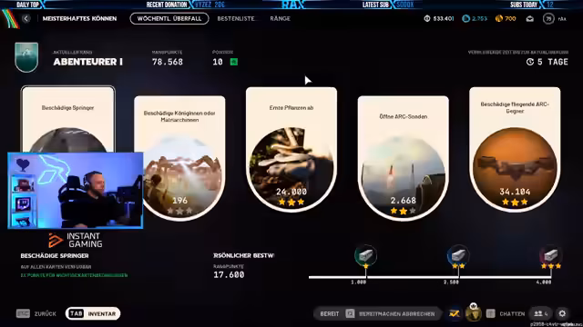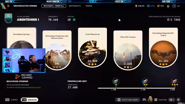04:44:47Der Stream wird von Harmy mit 2.180 Zuschauern geraidet, die zum Arc-Radar-Stream wechseln. Es wird eine Leaderboard-Analyse in Arc Raiders durchgeführt, wobei der Streamer seinen aktuellen Platz 10 und die Punkte eines spanischen Spielers namens Star Race vergleicht. Star Race hat beeindruckende 194.000 Punkte, während der Streamer noch weit davon entfernt ist. Es wird spekuliert, wie Star Race so viele Punkte erzielt hat, insbesondere durch das Töten von fliegenden Arctingern und das Sammeln von Pflanzen. Der Streamer plant, seine eigenen Punkte in den Kategorien "Ernte Pflanzen" und "Beschädigende Artgegner" zu verbessern, um im Leaderboard aufzusteigen. Es wird auch erwähnt, dass Star Race möglicherweise offstream gespielt oder sein VOD noch nicht veröffentlicht hat.