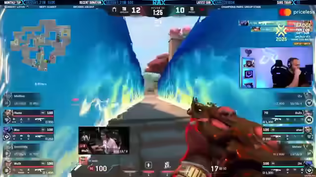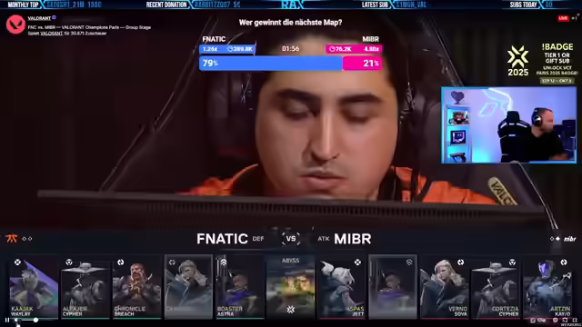06:25:04MIBR dominiert das Spiel und steht kurz vor dem Einzug in die Playoffs, was den Streamer überrascht, da er sie nicht in seinen Pick'ems hatte. Paper Rex, Energy und Heretics sind bereits in den Playoffs. Liquid könnte gegen EDG ausscheiden. Der Streamer äußert sein Bedauern über Fnatic's schwache Leistung und vermisst den Hype. Er glaubt nicht, dass jemand jemals den 100% Titel erreichen wird, da zu viele unvorhersehbare Dinge passieren. Es wird kurz über das Team Reddix gesprochen, welches stark spielt und T1 besiegt hat. Der Streamer bedankt sich bei den Zuschauern für die vielen Zappschneider und kündigt an, dass es weitere Giveaways geben wird, wenn Fnatic die Map gewinnt.