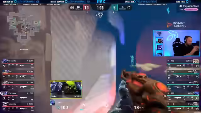 09:57:21Der Streamer begleitet das entscheidende dritte Map auf Ascent. Beide Teams zeigen eine starke Defensive, was der Kommentator als Schlüssel zum Erfolg für beide Seiten ansieht. Es wird die Taktik von Team Liquid mit Ara und Flickless auf der Angriffsseite analysiert, die als sehr aggressiv und explosiv beschrieben wird. Gleichzeitig hat Giant-X mit Spielern wie Cammo und Paddy einen Vorteil, da sie diese Map als Komfortmap sehen. Der Kommentator erwartet ein sehr aggressives Spiel von beiden Teams.