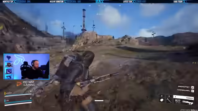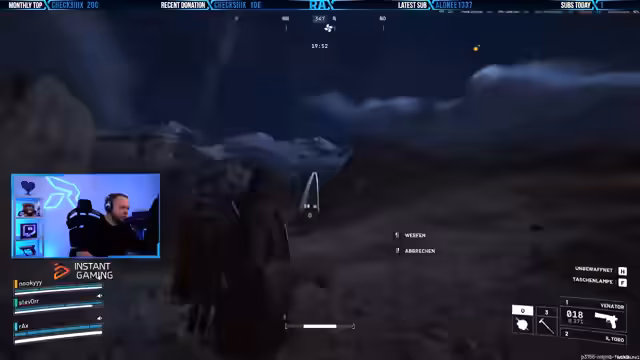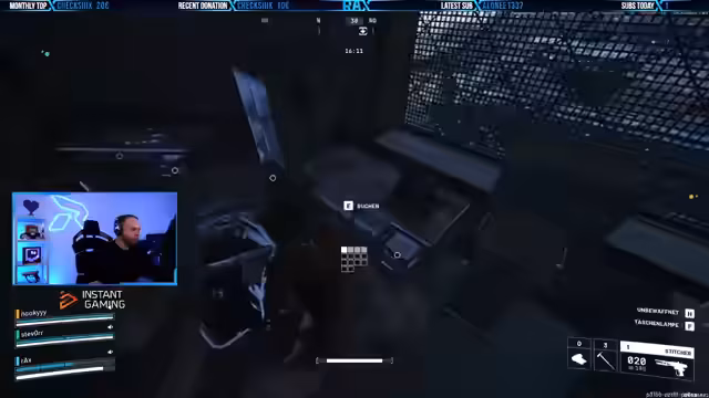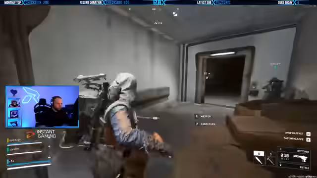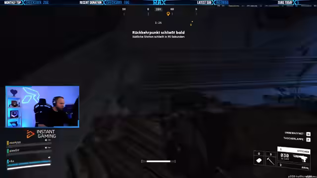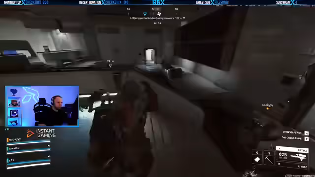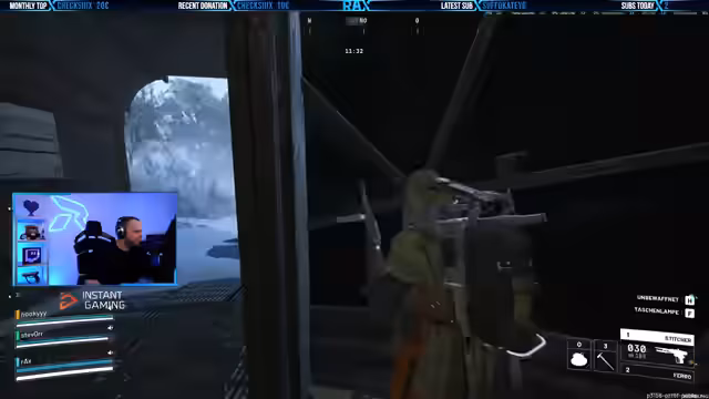 00:29:50Während einer Quest im unterirdischen Tunnel beim Raumhafen treten technische Probleme auf: Nach dem Durchsuchen von Objekten können Gegenstände wie Feuchtigkeitsmesser oder Nährstoffmessgeräte nicht aufgehoben werden, obwohl die Mission dies verlangt. Der Streamer versucht erfolglos, die Gegenstände in verschiedenen Gebäuden zu finden, und vermutet einen Bug. Parallel dazu finden intensive PvP-Kämpfe statt, bei denen das Team mehrere Gegner ausschaltet, aber durch Abzugsgranaten und Dritte-Partys dezimiert wird.