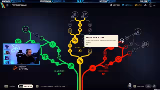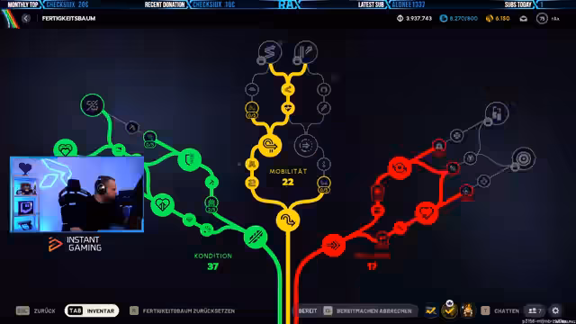 00:08:53Nach dem Zurücksetzen des Skillbaums für 152.000 Münzen wird ein neuer PvP-Baum präsentiert. Diskutiert werden Fähigkeiten wie reduzierte Ausdauerkosten für Ausweichrollen, erhöhte Regeneration bei Verletzungen und schnelleres Klettern. Besonders hervorgehoben wird die Fähigkeit 'Zurück auf die Füße', die nach einem Kampf schnelleres Aufstehen ermöglicht. Der Streamer optimiert die Punkteverteilung, um Gewichtsreduktion und Mobilität zu maximieren, und erklärt, wie er zukünftig durch Expeditions-Punkte den Baum erweitern wird.