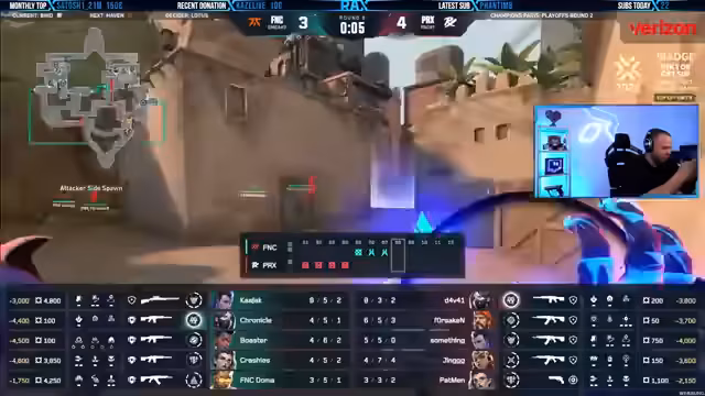 06:00:01Das Spiel wird als extrem spannend und intensiv beschrieben, mit besonderem Hinweis auf die Spieler Kayak, der als 'on fire' bezeichnet wird und eine beeindruckende Leistung zeigt. Es wird die historische Rivalität zwischen Fanatic und Paper Rex erwähnt, die bereits in den Toronto-Finals stattfand. Der Kommentator betont die herausragende Leistung der Teams und die hohe Qualität des gesamten Turniers, bei der alle Teams auf einem sehr guten Niveau spielen.