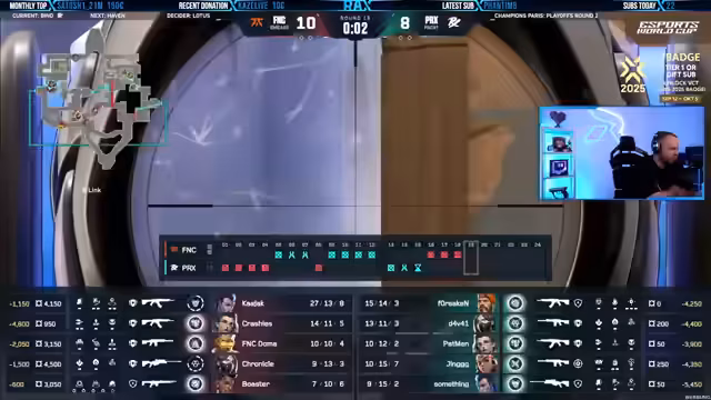 06:12:48Das Spiel wird als unglaublich angespannt und emotional beschrieben, mit mehreren knappen Runden und dramatischen Momenten. Es werden besondere Spielzüge und Strategien beider Teams analysiert, darunter das aggressive Vorgehen von Fanatic und die taktischen Entscheidungen von Paper Rex. Die Kommentatoren zeigen sich beeindruckt von der Qualität und Intensität des Matches.