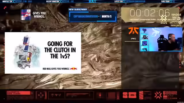 00:29:08Im weiteren Verlauf des Streams geht es um taktische Entscheidungen im Valorant-Gameplay, wobei der Streamer über seine Waffeinstellungen und Positionierungen spricht. Er kommentiert die Leistungen verschiedener Teams und Spieler, besonders die von Fnatic und Energy, und äußert sich zu unerwarteten Spielentscheidungen im laufenden Spiel.