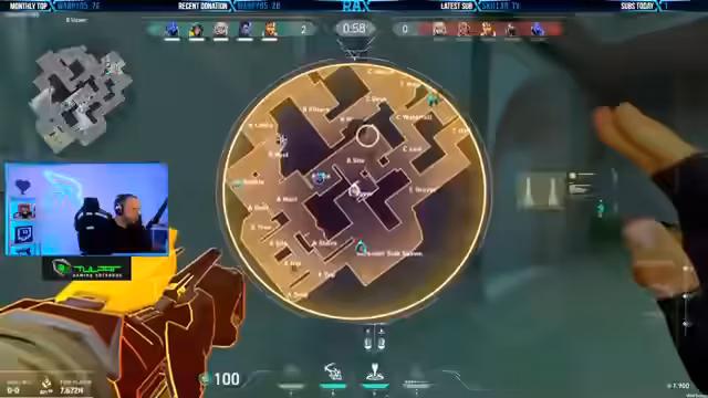 00:03:45Während des Spiels tauchen strategische Diskussionen auf. Es geht um die Kontrolle von Kartenbereichen wie A, B und C. Der Streamer analysiert Spielzüge seiner Mitspieler, kritisiert fehlerhafte Positionierungen und gibt taktische Anweisungen. Bei der Kommunikation zwischen Streamer und Team gibt es technische Verzögerungen, die die Koordination erschweren. Der Streamer versucht, die Verbindung zu Twitch zu überprüfen, um die Latenz zu verringern und eine bessere Abstimmung zu ermöglichen.