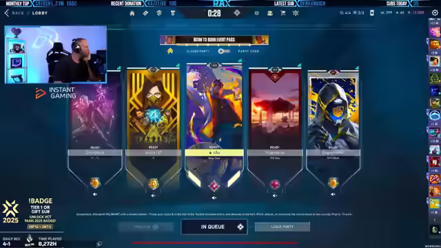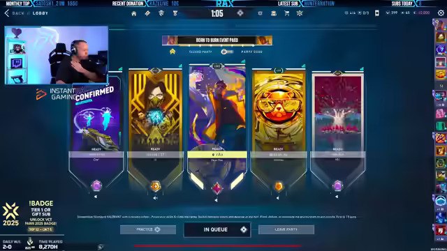 03:10:38Es werden die Namen derjenigen vorgelesen, die einen Sub erhalten haben. Es wird die Energie und Synergie im 5-Stack hervorgehoben. Anschließend wird Ranked Valorant gespielt, wobei der Fokus auf 'Ranked, YOLO rein' liegt. Es wird Viper als Agent gewählt, obwohl der Streamer sie länger nicht gespielt hat. Im Chat wird auf die Möglichkeit hingewiesen, Valorant Guthaben bei Instant Gaming zu erwerben, um den Streamer zu unterstützen. Die spontane Entscheidung über die Streamdauer wird diskutiert, wobei eine ungefähre Endzeit von 17 Uhr in Aussicht gestellt wird, gefolgt von einem Spaziergang mit dem Hund und der anschließenden Reise.
