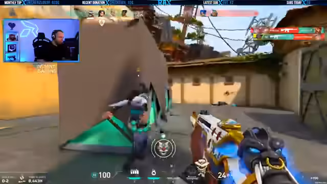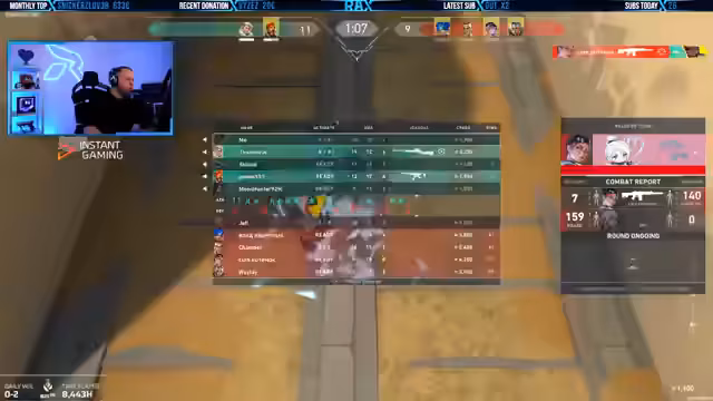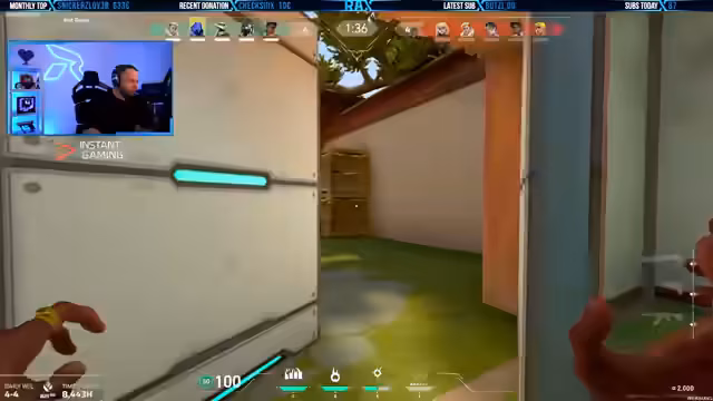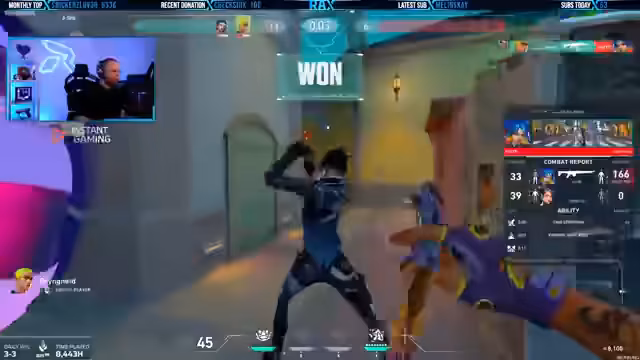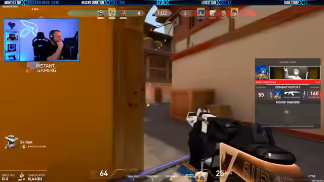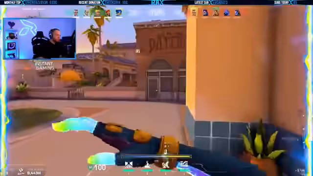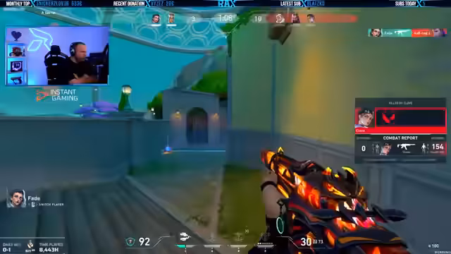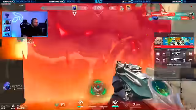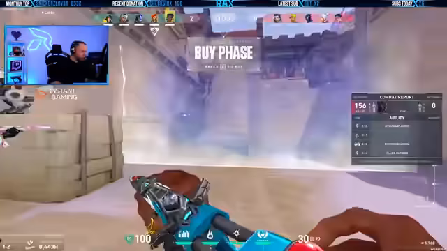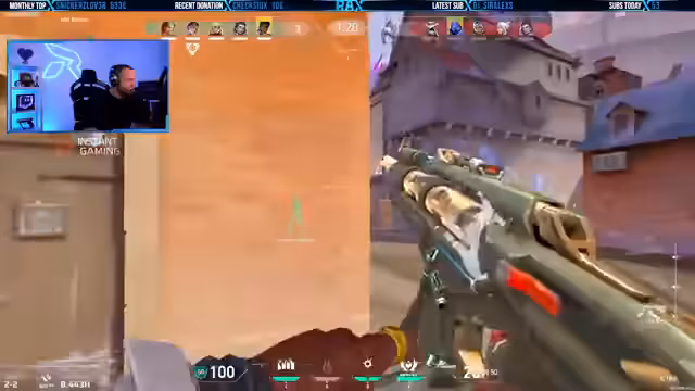 01:53:54Angesichts der aggressiven Gegner-Line-Ups (Jet, Neon, Chamber, Blowoff, Waylaid), die immer peeken wollen, empfiehlt der Streamer eine defensive Spielweise. Man sollte versuchen, Kills zu erzielen, indem man defensiv ab-aimt und auf Pusher wartet, anstatt selbst aggressiv zu peeken. Er demonstriert dies, indem er eine Flash verzögert einsetzt, die jedoch schlecht platziert ist. Trotz des Fehlers gelingt es dem Team, einen Gegner auszuschalten. Er bemerkt, dass die Gegner schnell rotieren, was ein weiteres taktisches Element darstellt.