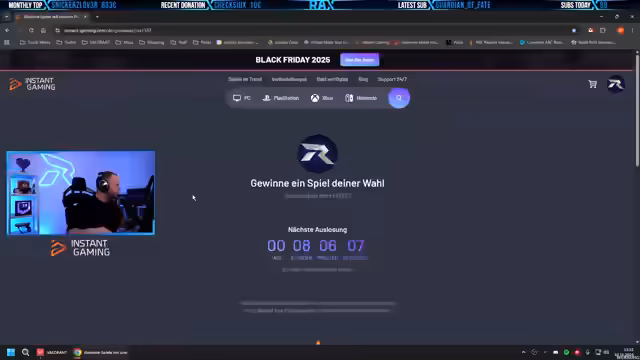 03:08:42Der Streamer bewirbt die laufenden Black Friday Angebote bei Instant Gaming, die noch bis morgen gültig sind. Zuschauer können über einen speziellen Link auf die Website zugreifen, um von maximalen Rabatten auf Spiele und Guthabenkarten zu profitieren. Es wird erklärt, dass Instant Gaming regelmäßig Gutscheine und Guthaben für verschiedene Plattformen wie Valorant und PlayStation zu reduzierten Preisen anbietet, wodurch erhebliche Einsparungen möglich sind. Ein besonderes Highlight ist die Aktion, bei der jede Stunde ein gesamter Warenkorb erstattet wird, was den Kauf von Spielen und Guthaben noch attraktiver macht. Zusätzlich wird ein Giveaway beworben, bei dem die Teilnehmer die Chance haben, ein Spiel ihrer Wahl kostenlos zu gewinnen. Die Auslosung findet in 12 Stunden statt, was den Zuschauern eine letzte Gelegenheit gibt, sich anzumelden und teilzunehmen. Der Streamer betont, dass diese Angebote eine gute Möglichkeit sind, Geld zu sparen und gleichzeitig den Kanal zu unterstützen.