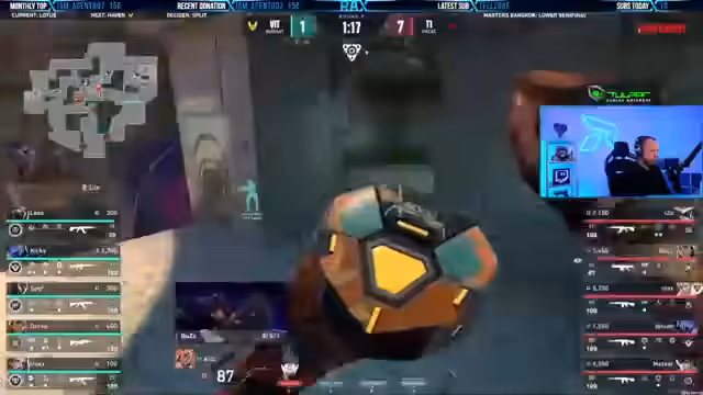 04:02:15Für die dritte Map, Split, wird eine Wette eröffnet. Der Streamer erklärt die Konstellation der Playoffs: Der Sieger des aktuellen Spiels zwischen Vitality und T1 wird im Lower-Bracket-Finale gegen EDG antreten, den Verlierer des Spiels zwischen G2 und EDG. Der Gewinner dieses Lower-Bracket-Finales zieht dann ins Grand Final ein. Er lobt Les für einen wichtigen Vierfach-Kill und betont die Wichtigkeit der Pistolenrunde. Es wird kurz auf den Velo Cup eingegangen, bei dem die Teams zufällig zusammengestellt werden. Scream hat ein Comeback angekündigt.