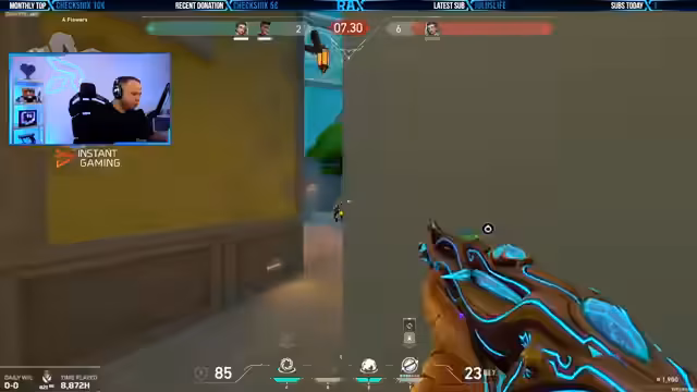02:23:35Ein Match beginnt auf der Map Haven. Der Streamer plant, mit Cypher zu spielen und erwähnt die Möglichkeit, stattdessen Omen einzusetzen, falls die Team-Konfiguration das erfordert. Er fordert die Zuschauer auf, sich anzuschnallen und kündigt ein ansprechendes Cypher-Gameplay an. Die Runde beginnt, und der Streamer nimmt eine aggressive Position in der unteren Zone der Karte.