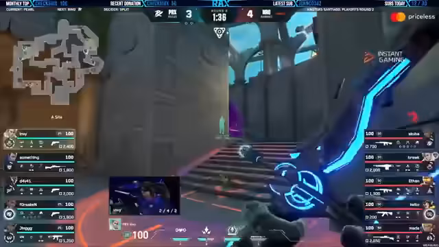 03:12:17Der Modus des Map-Picks und Vetos für das anstehende Match zwischen Paper Rex (PRX) und NRG wird live dargestellt. NRG wird als Team A festgelegt und beginnt mit dem Ban von Haven. PRX antwortet mit dem Ban von Abyss. NRG wählt Pearl als erste Map und startet auf der Verteidigungsseite, während PRX auf Bind angreift. Als letzte Map wird mit NRG in Verteidigung auf Split gespielt.