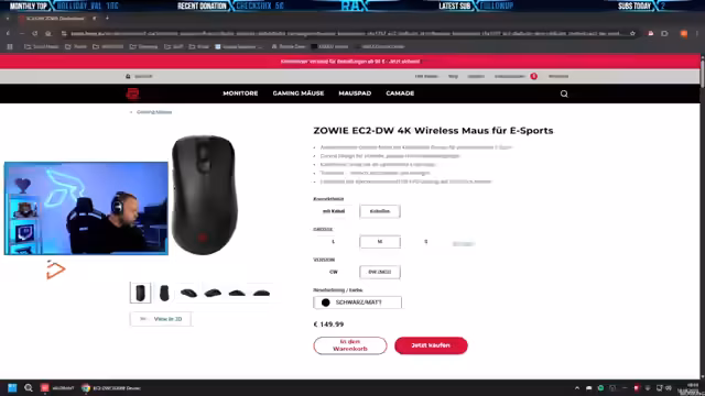 02:24:14Ein Schwerpunkt des Streams ist das Testen der neuen ZOWIE EC2DW Maus. Der Streamer stellt das asymmetrische Design vor und erklärt die Vorteile im Vergleich zu älteren Modellen. Er demonstriert den Online-Shop, wo verschiedene Größen erhältlich sind, und gibt den Tipp, am besten mehrere Mäuse zu bestellen und zu testen, um die perfekte Form für die eigene Hand zu finden. Er betont, dass dies speziell für Rechtshänder konzipiert ist.