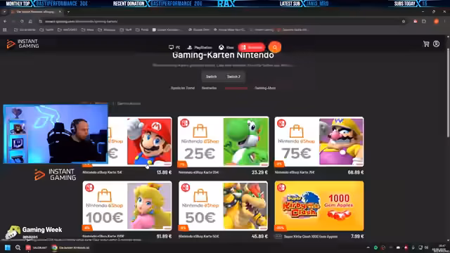 07:03:37Es wird eine Partnerschaft mit Instant Gaming beworben. Durch die Nutzung des Links im Chat beim Kauf erhalten Zuschauer Rabatte, zum Beispiel 8.700 Punkte für 64 Euro statt 80 Euro. Es wird ein monatliches Giveaway beworben, bei dem man mit einem Klick auf den 'Teilnehmen'-Button eine kostenlose Ware auswählen kann. Der Streamer erklärt die Vorzüge des Kaufs auf der Plattform, wie Guthabenkarten ohne Steuer.