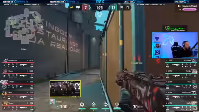 00:11:55Im ersten Spiel konzentriert sich das Team auf taktische Entscheidungen für das Bommen-Layout. Der Streamer agiert als Anführer und gibt klare Anweisungen, z.B. A zu starten, Raze als Entry-Fragger einzusetzen und Breach für Stuns zu nutzen. Er versucht, das Spiel auf A zu konzentrieren, und erteilt Anweisungen wie 'B-Step, B-Step' und 'Push nicht, push nicht jetzt', um die Verteidigung der Gegner zu testen und die Bombenplatzung vorzubereiten.