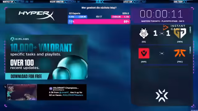 03:11:57G2 dominiert das makro Spiel auf Haven. Durch konsequentes Recleren von strategisch wichtigen Zonen, insbesondere der Garage, und das Sammeln von Informationen zwingen sie Gen.G in eine reaktive Rolle. Ihre Fähigkeit, das Spiel zu kontrollieren und Gen.Gs Vorhersagen zu kontern, führt zu einer deutlichen Führung in der Map.