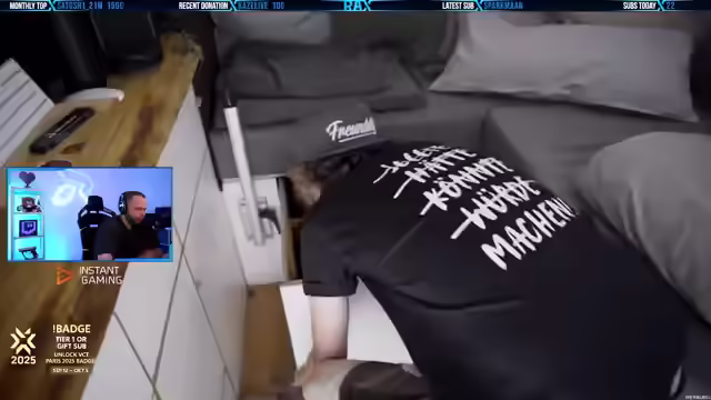 Eine Valorant-Sub-Aktion mit möglichen Zusatzzahlungen wird angekündigt, parallel zur VCT Paris Watch Party. Der Streamer diskutiert Cheater-Problematik, höhenverstellbare Schreibtische, Bürostühle und die steuerliche Absetzbarkeit von Skins. Ein Pokerturniersieg und Vanlife-Überlegungen runden das Programm ab.