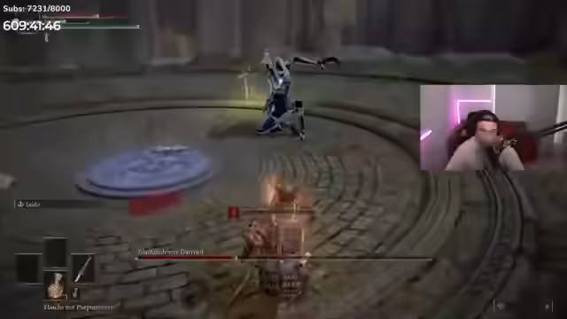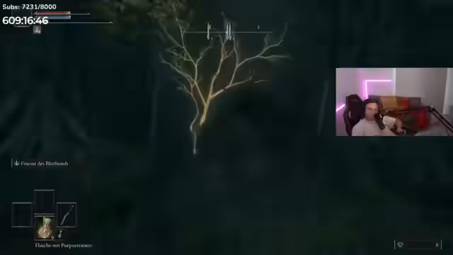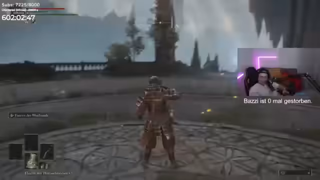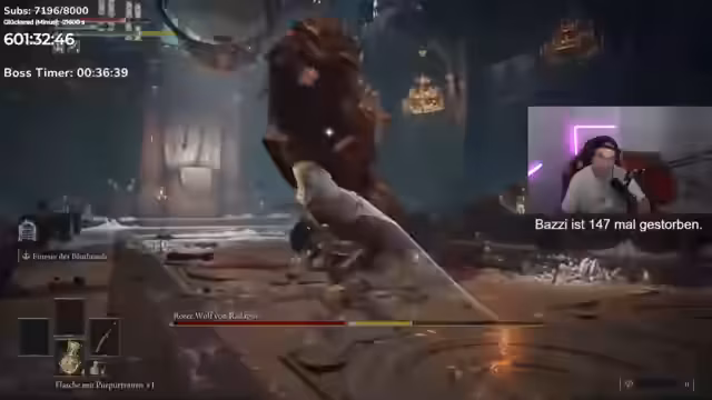 17:10:12Nach dem technischen Ausfall geht der Streamer in Elden Ring weiter. Sein Fokus liegt darauf, die benötigten Waffen für die aktuelle Aufgabe zu finden. Er trifft auf einen Charakter, dem er eine Waffe stehlen muss, was den Kampf gegen dessen Pferd erfordert. Anschließend reiten die beiden zu einem anderen Ort, um eine spezielle Waffe namens „Bluthundreißzahn“ zu besorgen. Nach der Beschaffung erfolgt die Ausrüstungswechsel, um den Schaden zu maximieren, und die Reise zum eigentlichen Boss beginnt.