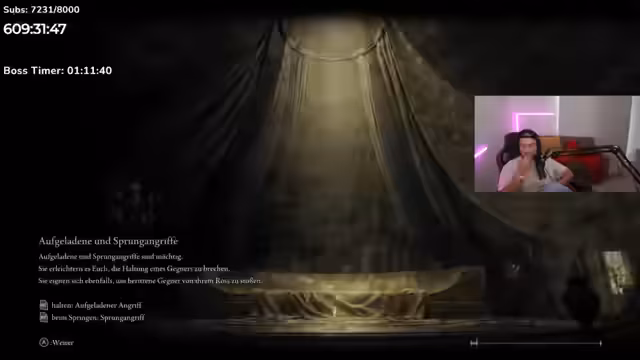 17:09:44Das Spiel stürzt ab, was zunächst Erleichterung auslöst, aber es funktioniert dann doch wieder. Es wird überlegt, eine andere Waffe zu holen, um den aktuellen Boss zu besiegen, da die Zeit drängt. Der Streamer ignoriert Tipps von Zuschauern und besteht darauf, das Spiel selbst zu lernen. Ein Bug mit Stream-Elementen wird vermutet, was zu Diskussionen im Chat führt. Es wird beschlossen, einen Checkpoint mitzunehmen und sich auf das Finden der anderen Waffe zu konzentrieren, um den Boss innerhalb des Zeitlimits von zwei Stunden zu besiegen. Der Streamer betritt ein Siegelgefängnis, um gegen einen Gegner zu kämpfen, der zwar wenig Verteidigung hat, aber dennoch eine Herausforderung darstellt. Trotzdem soll der Gegner machbar sein, da er viel Schaden nimmt. Der Fokus liegt auf dem Einsatz von L2-Angriffen und dem Vermeiden von Ducken im Kampf.