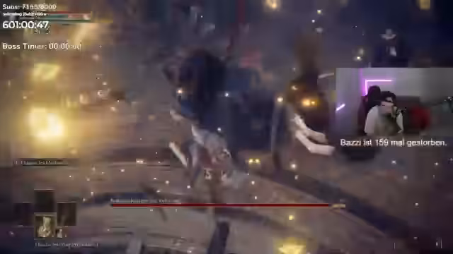 16:37:09Der Streamer und sein Helfer GoMorro sind nah am Bossziel und müssen sich nun durch ein gefährliches Gebiet kämpfen, das von feindlichen NPCs bewacht wird. Sie begegnen einem Gegner, den sie zunächst nicht als Boss erkennen, aber der sich als sehr stark erweist. Nach mehreren gescheiterten Versuchen und massiven Schwierigkeiten mit den Kampfmechaniken, insbesondere dem Timing der Ausweichmanöver, gelingt es ihnen endlich, diesen NPC zu besiegen und die ersten sechs Stunden vom Stundenkonto abzubauen.