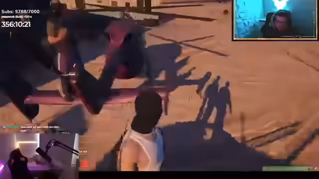 15:03:38Es wird überlegt, den Affen für kriminelle Aktionen einzusetzen, wie beispielsweise die Crips zu 'scheppern'. Der Affe zeigt dem Streamer den Mittelfinger. Der Affe wird in ein geklautes Auto gesetzt, um mit ihm zu fliehen. Der Streamer schlägt vor, Polizisten mit dem Affen als Geiselnehmer zu entführen. Der Plan sieht vor, dass der Affe eine Pistole an einen Polizisten hält. Es stellt sich heraus, dass der Affe keine Pistole hat und der Plan scheitert. Der Streamer kontaktiert einen 'Alman' namens Salman, um Hilfe zu bekommen, da die Polizei wegen des geklauten Autos hinter ihnen her ist. Salman bietet an, die Polizei mit dem Affen zu beschießen. Ein anderer Charakter, Heres, bietet an, Schlüssel zu geben, wird aber verdächtigt, das Auto klauen zu wollen. Der Affe soll ihn 'abkleiden', falls er das Auto klauen sollte.