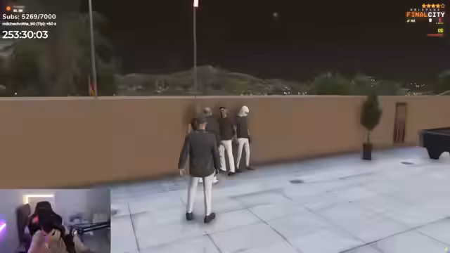 05:27:23Nachdem Frust abgelassen wurde, thematisiert der Streamer die Besitzverhältnisse von Autos und äußert seinen Ärger über einen Spieler. Es folgt eine Warnung an Selina, jegliche Auseinandersetzungen kurz vor einem Krieg zu unterlassen. Anschließend wird die Situation mit einer Person besprochen, die Schutzgeld vom Unicorn erpressen will und behauptet, im Auftrag anderer zu handeln. Der Streamer weist diese Behauptung entschieden zurück und fordert den Erpresser auf, zu verschwinden. Er betont, dass man anderweitig beschäftigt sei und artikuliert sich dabei eloquent, was ironisch kommentiert wird. Abschließend wird die Szene mit einer Anspielung auf Alpecin verlassen.