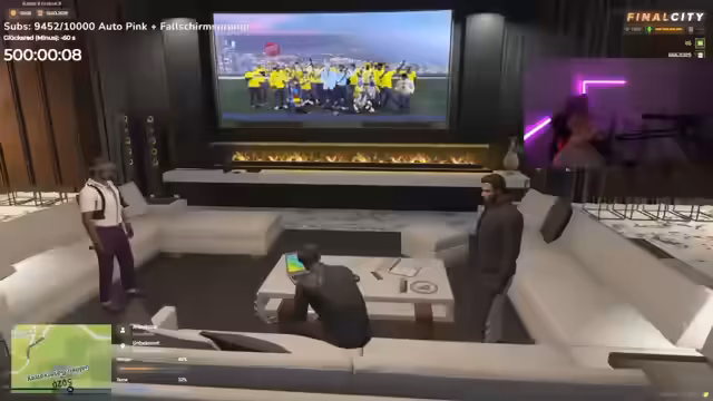 07:45:00Im Rollenspiel-Modus rettet der Streamer eine Frau, die von 'zehn nackten Männern' umzingelt ist. Er identifiziert sich selbst als Retter und fordert sie auf, sich bei ihm zu bedanken. Die Situation eskaliert verbal, als er eine Spende von 10 Millionen fordert, bevor die Frau Zugang zu seinem Café erhält. Die Diskussion verschiebt sich schnell auf Luxusautos wie Lamborghini und Urus, und der Streamer stellt sich selbst als reiche Person dar, die ihren Status mit Geld unterstreicht.