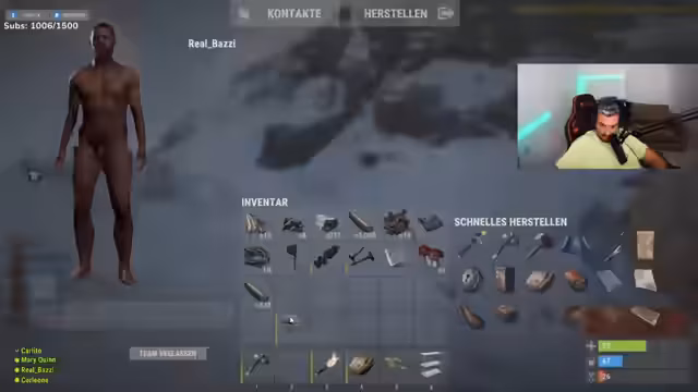 03:29:56Die Gruppe trifft auf einen nackten Charakter und es kommt zu einer humorvollen Auseinandersetzung über dessen Aussehen und Geschlecht. Der Charakter beteuert, keine Gegenstände zu besitzen und kürzlich von einem anderen Spieler getötet worden zu sein. Es wird versehentlich der Schwanz des Charakters getroffen. Die Gruppe beschließt, den Charakter am Leben zu lassen. Es folgt eine Diskussion darüber, ob man Freunde oder Feinde suchen soll. Ein Mitspieler wird versehentlich mit einem Speer getroffen, was zu Verwirrung und Streit führt. Es wird über den Verlust von Gegenständen und die Schwierigkeit, zum Team zurückzukehren, geklagt. Es wird überlegt, ob ein anderer Spieler die Gegenstände mitgenommen hat. Es wird festgestellt, dass der Charakter ein Aggressionsproblem hat und ständig töten muss. Es wird über Tierfett und Wölfe gesprochen. Es wird festgestellt, dass die Basis nicht angegriffen wurde. Es wird überlegt, Pillen wegzuwerfen und es wird nach Metallschrott gesucht. Es wird angekündigt, dass die Gruppe angegriffen wird. Es wird überlegt, wie man global chatten kann. Es wird über den Verlust von Gegenständen und die Notwendigkeit, eine Basis zu bauen, diskutiert. Es wird darüber diskutiert, wo die Basis gebaut werden soll, wobei die Nähe zum Wasser als wichtig erachtet wird. Es wird die Angst vor Überschwemmungen geäußert.