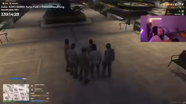 00:10:16Der Streamer wechselt abrupt das Thema zum Gaming. Er meldet einen Konflikt mit einem Spieler namens Barolo, der ihn angeblich an eine andere Gruppe namens Bitcoin verkauft hat. Er fordert seine Gruppe auf, Barolo gefesselt zu stellen und ihn zum Laufen zu bringen, um Loyalität zu testen. Gleichzeitig flieht ein weiterer Spieler namens Abdel vor der Polizei, was der Streamer im Funk kommuniziert und den Spielern Anweisungen für Verfolgungsjagden gibt.