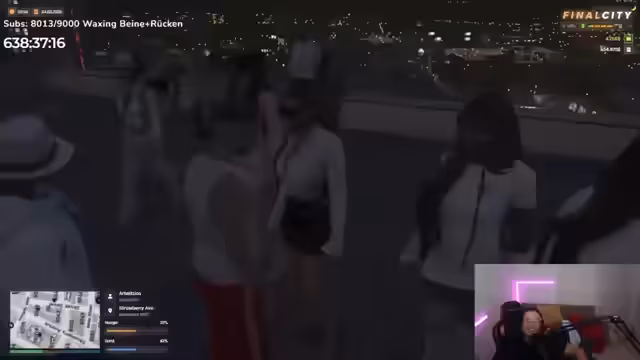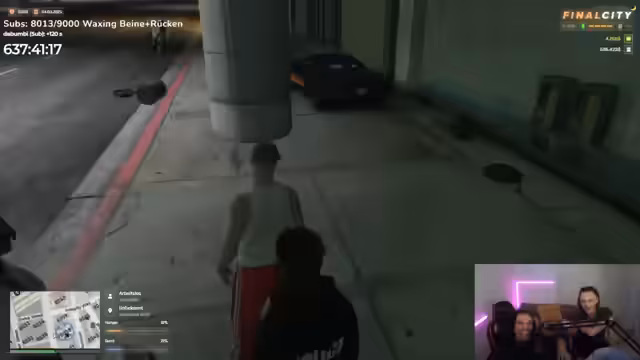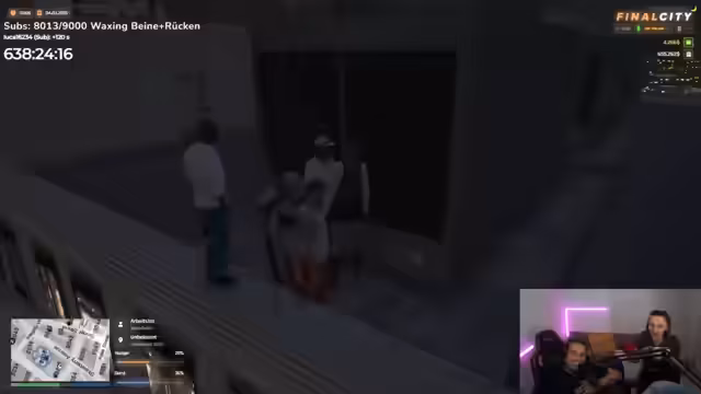 03:05:37Nach dem Austritt aus der Monster-Gruppe wechselt der Stream in das Rollenspiel 'Final City'. Er und sein Partner Kalito betreten eine fiktive Stadt, die von Gangs und Kriminalität beherrscht wird. Sie erleben eine chaotische Einreise, die durch technische Probleme und unpassende Verhaltensweisen anderer Spieler gestört wird. Sie interagieren mit anderen Charakteren, die RP-Interaktionen (In-Character) von OOC (Out-of-Character) Kommunikation unterscheiden.