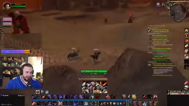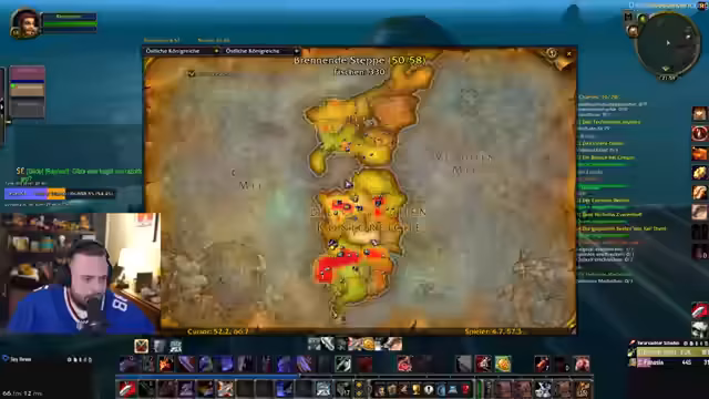 03:50:01Das Team beginnt, in der "Brennenden Steppe" zu questen und konzentriert sich zuerst auf das Ausmerzen der Ogereinheiten. Ein strategischer Fehler geschieht jedoch, als der Streamer versehentlich in einen Bereich mit mehr Gegnern als geplant läuft und AOE-Schaden (Wirbelwind) erhält. Er überleitet dies knapp, doch es verdeutlicht die Gefahr der Gegend und die Notwendigkeit, sich strikt an die Pull-Strategie zu halten.