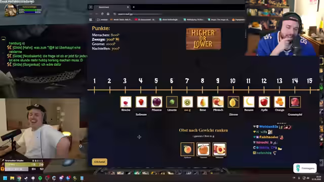 00:00:00Der Stream beginnt mit einem PC-Absturz, der den Streamer kurz unterbricht. Nach der Rückkehr wird das erste Grind-Board, 'Obst', gestartet, bei dem die Zuschauer aufgefordert werden, verschiedene Obstsorten nach ihrem Gewicht zu sortieren. Der Streamer kommentiert die Versuche der Zuschauer, die oft falsch liegen, und gibt punkte für richtige und falsche Versuche. Es stellt sich heraus, dass dieses Board besonders schwierig ist, was zu Frustration führt, da es sehr lange dauert und die Punktestände der verschiedenen Völker (Menschen, Zwerge, Gnome, Nachtelfen) sich nur langsam ändern.