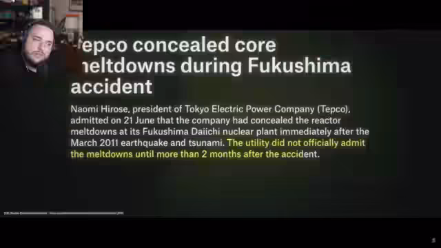 01:14:15Der Streamer beginnt mit dem Anschauen der Doku "Fukushima – Die unfassbare Katastrophe". Er erläutert die technische Funktion eines Atomkraftwerks und wie die Reaktoren nach dem Erdbeben und dem darauffolgenden Tsunami automatisch abgeschaltet wurden. Da die externe Stromversorgung ausfiel, sprangen die Notstromgeneratoren an. Doch der Tsunami überflutete diese, was zum Ausfall der Kühlung führte. Dies war der Beginn einer extrem gefährlichen Situation, die zu einer Kernschmelze hätte führen können, da die Brennstäbe ohne Kühlung extrem heiße und radioaktive Massen bilden würden.