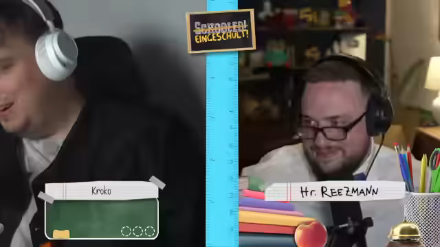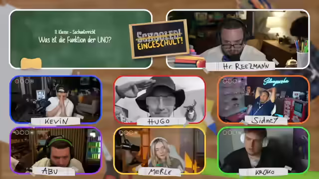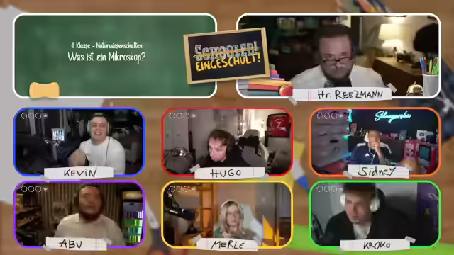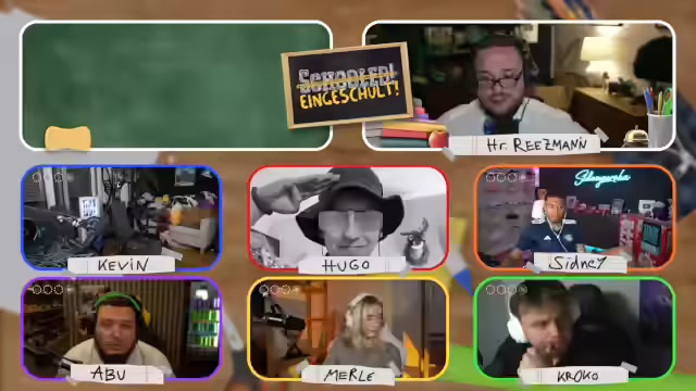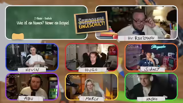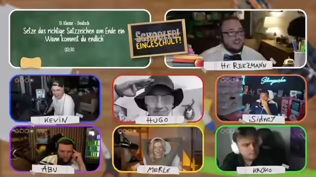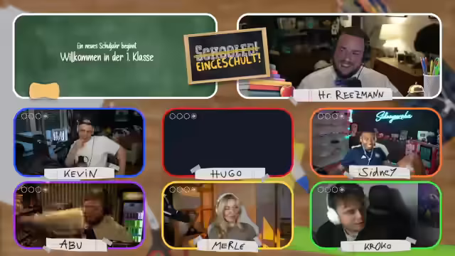 01:08:40Der Stream beginnt mit technischen Herausforderungen, als Hugo bei der Verbindung ins Klassenzimmer auf Probleme stößt. Nach erfolgreicher Einrichtung stellt der Streamer die Quizshow als virtuellen Unterricht vor, bei dem er die Rolle des Lehrers Herr Reetzmann übernimmt. Es werden die Regeln des Spiels erläutert: Pro Klassenstufe gibt es vier Fächer mit je einer Frage, bei einer falschen Antwort (Note 6) fliegt man aus dem Format. Einmal pro Spiel darf man bei einem Mitspieler spicken.