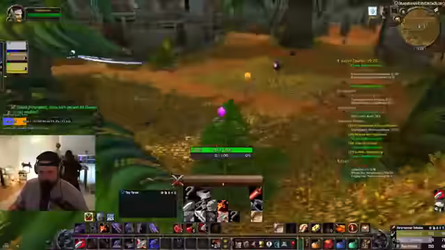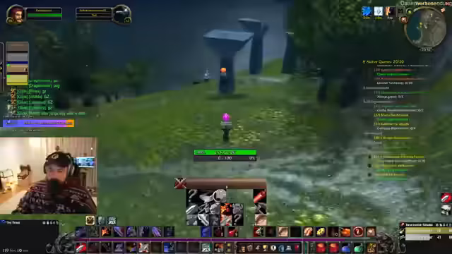 10:04:26Nachdem eine Falle platziert wurde, besiegt die Gruppe einen Boss, wobei Gambeln auf Rage und Potion-Nutzung diskutiert wird. Anschließend folgen Trades in der Höhle, der Bedarf eines 'Target Nearest Enemy'-Makros und die Notwendigkeit, Kutscher nach Sturmwind zu schicken. Es werden Quests im Gebiet besprochen, darunter Sammelquests und die Entscheidung, vier offene Quests schnell zu erledigen, während Hanky als Gruppenmitglied mit geringem HP erwähnt wird.