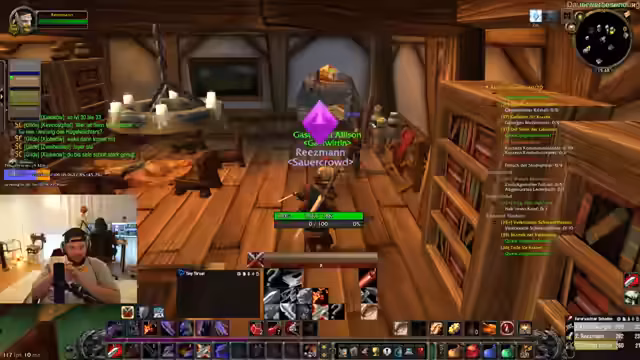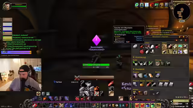 07:18:46Die Spieler optimieren ihre Ausrüstung: Ein Krieger entscheidet sich für einen neuen Zweihand-Knüppel und überlegt, alte Waffen zu verkaufen oder in die Bank zu geben. Gleichzeitig wird die Gildenbank verwaltet, wo Wollstoff und andere Ressourcen deponiert werden. Diskussionen über fehlende Questitems wie 'Lebenswurz' für eine Krieger-Axt-Quest führen zu Absprachen mit anderen Spielern. Ein Spieler erkundigt sich nach einem Dolch in der Gilde. Geplant sind weitere Quests in Schlingendorn und Dersolist, wobei besonders ein Quest-Zweierpack in Dersolist als lohnend hervorgehoben wird.