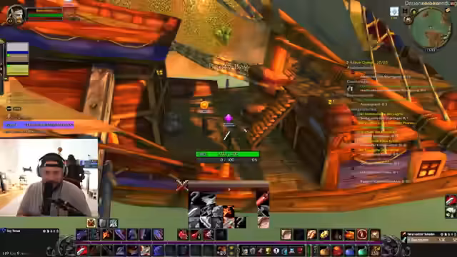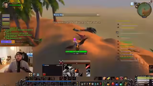 04:55:00Organisation der Reise nach Booty Bay: Die Gruppe plant, nach Buffs in Sturmwind direkt nach Booty Bay zu fliegen, um den Dungeon 'Kloster' zu starten. Sie diskutieren die Nutzung einer Webseite zur Koordination von Buffs für alle Spieler in der Stadt und die optimale Flugroute (Sturmwind → Booty Bay vs. South Shore). Probleme mit einem verbuggten Flugmeister und Zeitdruck werden erwähnt. Zusätzlich geht es um die Lagerung von Quest-Items in der Bank und die Beschaffung von Gold für Verzauberungen und Ausrüstung.