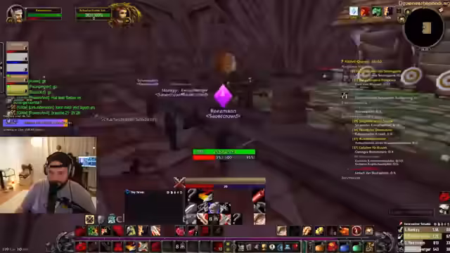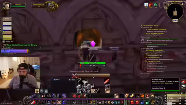 01:54:53Für den geplanten Dungeon 'Kloster' (Gnome) wird die Gruppenzusammenstellung vorbereitet. Siegewinn Hanky (Level 34 Krieger) und Dalu (Level 43 Schurke) werden als potenzielle Teilnehmer identifiziert. Die Gruppe diskutiert die Quest 'Bruder Anton' für Desolais, die ein Best-in-Slot-Messer für Schurken belohnt, und plant, Hanky und Dalu in die Gruppe zu integrieren. Gleichzeitig wird die Koordination mit Sun Glitters für gemeinsames Questen im Alterack-Gebirge erwogen, wobei die schwierige Questlage und die Risiken bei Alleingängen betont werden.