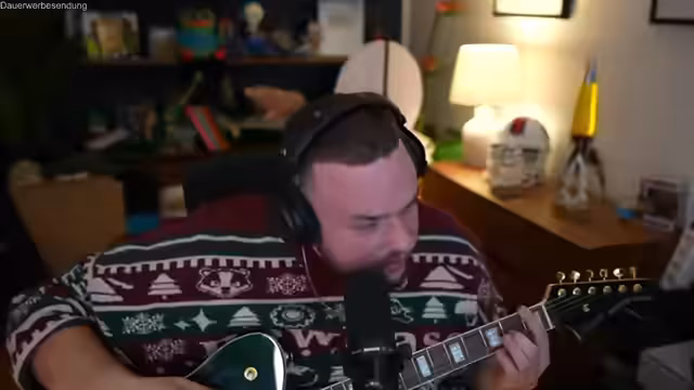00:51:50Der Streamer spielt das Spiel Rocksmith, indem er versucht, leere Saiten zu spielen. Obwohl ihm dies sichtlich schwerfällt und er seine Gitarre neu stimmen muss, sieht er darin eine motivierende Lernmethode. Gemeinsam mit einem anderen Streamer, Chris, probiert er das Spiel aus, das ihm gefällt, weil es die echte Gitarre nutzt und Songs in Schwierigkeitsstufen einteilt. Der Streamer ist motiviert und plant zukünftige Jam-Sessions mit Henke, bei denen sie die Gitarre umstimmen könnten, um einfache Akkorde zu üben.