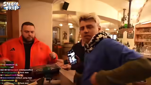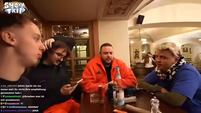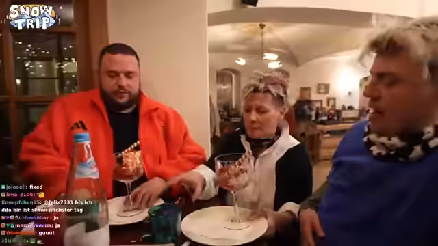 00:19:40Nach dem Snowboarden beginnt die Suche nach einem Essensort. Die Suche gestaltet sich schwierig, da viele Restaurants geschlossen sind oder nur Pizza anbieten, was nicht bei allen Ankömmlingen gut ankommt. Parallel dazu interagiert die Gruppe stark mit der Community. Es werden viele Spender und Subscriber genannt und gelobt. Ein Höhepunkt ist die Ankündigung, dass bei Eintreffen einer bestimmten Anzahl an Subscription-Geschenken einer der Streamer in Leggings in das Restaurant gehen werde.
