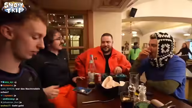 00:23:55Schließlich wird ein Restaurant gefunden und die Gruppe setzt sich zum Essen an. Währenddessen werden verschiedene Themen angesprochen, darunter die gegensätzliche Meinung über Schmerzmittel. Nach dem Essen ist das 'Nachtrudeln' das nächste geplante Programm, also das nächtliche Snowboarden. Es gibt kleine technische Probleme beim Streamen und die Gruppe diskutiert über das weitere Vorgehen nach der Essenspause, bei der sie wohl direkt zum Nachtrudeln weiterziehen werden.