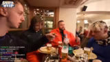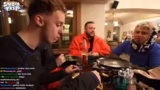 00:33:31Am Tisch angekommen, wird bestellt. Währenddessen kommen verschiedene Gespräche auf, etwa über die Vor- und Nachteile von Schmerzmitteln oder die Generunterschiede bei der Ernährung. Die Gerichte werden beschrieben und für manche, wie das Tomahawk-Steak, gibt es Diskussionen über die gewünschte Gare. Auch Anime-Themen kommen zur Sprache, und die Situation am Tisch, bei der der Streamer mit Bauch auf dem Tisch sitzt, wird als komisch beschrieben.