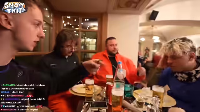 02:02:05Die Szene verlagert sich zu einem Restaurantbesuch, bei dem extrem große Mengen an Essen bestellt werden, was zu einem vollen und zufriedenen Magen führt. Daraufhin wird ein von einem Gast gespendetes Bier mit intensiven Diskussionen über den Konsum von Alkohol vor dem Führen eines Autos begleitet. Die Streams diskutieren intensiv über Verantwortung und den gesellschaftlichen Druck, trinken zu müssen. Der Fokus liegt hier auf den sozialen Interaktionen und den Herausforderungen des Gruppendynamik.