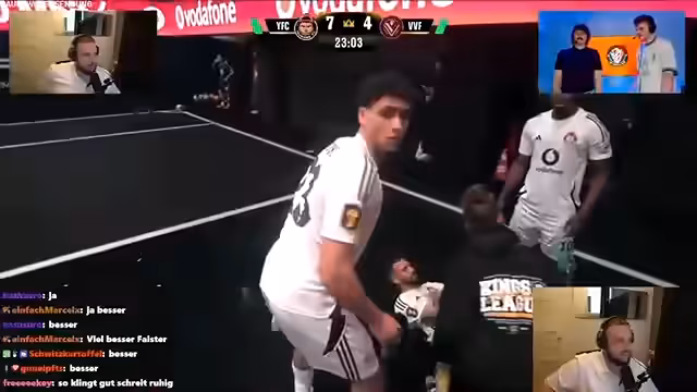 01:57:11Die Kommentatoren bereiten sich intensiv auf das anstehende Spiel vor. Hierbei stehen technische Aspekte im Vordergrund, wie das Einrichten des Mikrofons und das Herstellen einer klaren Verbindung in einem Discord-Call. Es kommt zu Problemen mit der Lautstärke und der Verständlichkeit, die jedoch nach und nach gelöst werden. Das Ziel ist ein reibungsloser gemeinsamer Stream während der Kings-League-Partie.