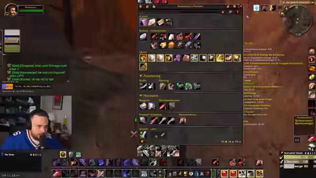 04:32:13Der Streamer teilt seinen Status als Berufsspieler und gibt bekannt, dass er noch mehr grüne Gegenstände aus Dungeons benötigt, um seinen Beruf aufzuwerten. Es kommt zu einem Streit über die Verteilung eines Rucksacks, der per Würfel verteilt wird. Der Chat spielt eine große Rolle, da der Streamer ständig auf Kommentare reagiert und Anfragen für Hilfe oder Tipps erhält, was das interaktive Element des Live-Streams unterstreicht.