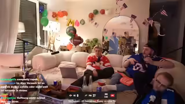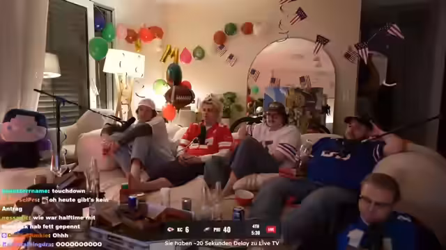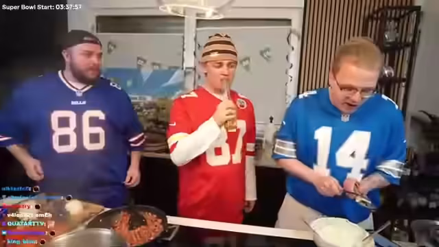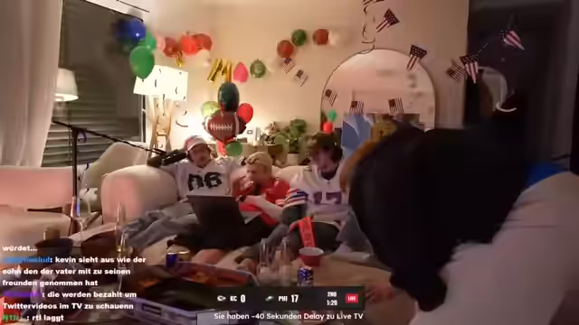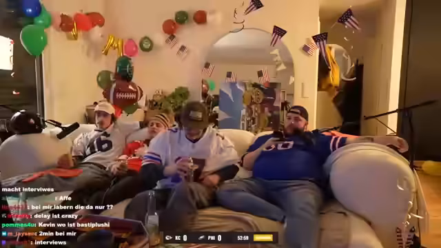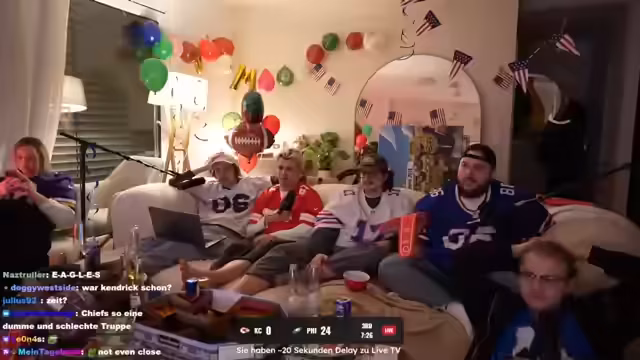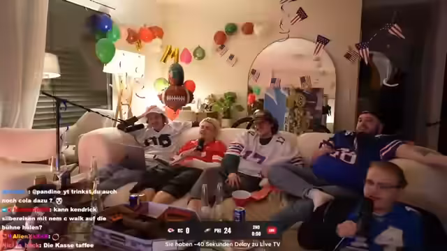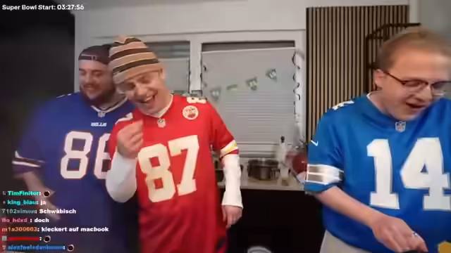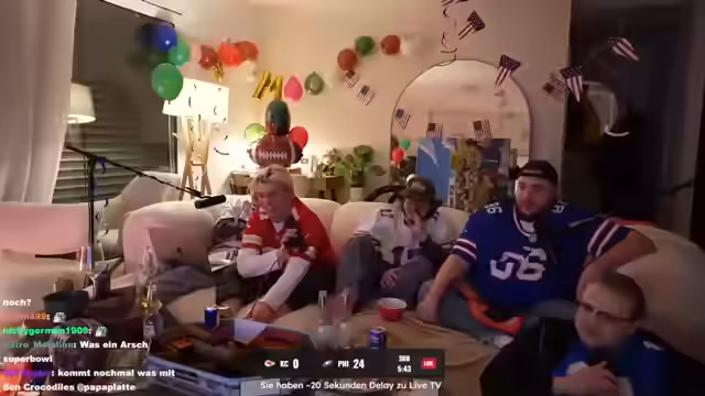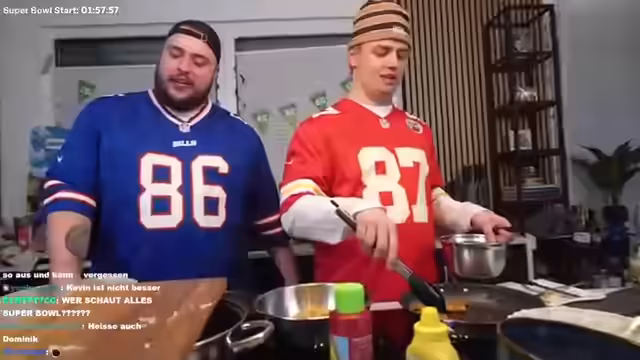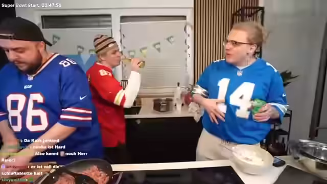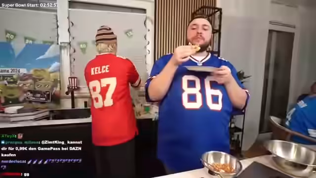 01:00:58Die Streamer sind mit den Vorbereitungen für die Superbowl-Watchparty fast fertig. Sie haben das Snackstadion aufgebaut, die Snacks zubereitet und sich über ihre Teampräferenzen klar geworden. Einer von ihnen ist klarer Unterstützer der Kansas City Chiefs und wird sie während des Spiels anfeuern. Der Stream geht nun in die finale Phase vor dem Start des Spiels.