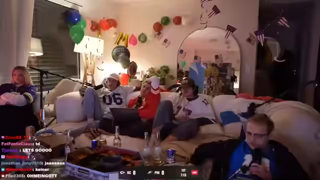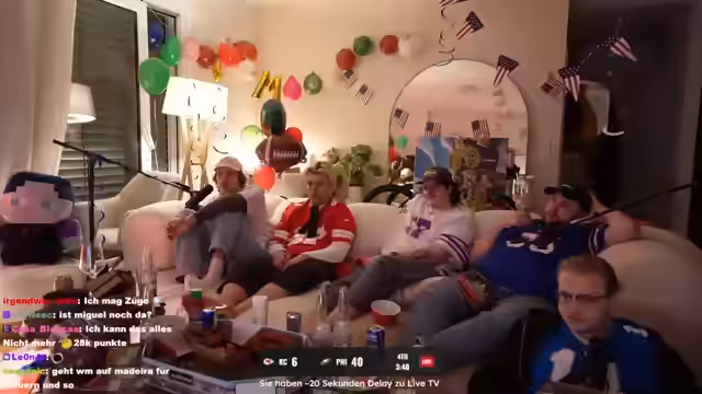 05:24:53Der Anpfiff des Spiels erfolgt und Reeze versucht, die Zeit zu timen, was sich als schwierig erweist. Es wird festgestellt, dass die Gruppe hinterherhinkt und dass es für Watchpartys eine bessere Lösung geben müsste. Reeze bedauert, dass Twitch die Watch-Partys mit Twitch Prime abgeschafft hat. Die Gruppe diskutiert über die unterschiedlichen Delays zwischen Internet und Kabelfernsehen und bedauert, dass sie kein Fernsehabo haben. Reeze fragt sich, warum die Helm-Designs nicht überarbeitet werden und schlägt vor, dass sie cooler aussehen könnten. Er kritisiert das Design der Eagles-Helme, bei denen die Flügel vorne verbunden sind. Die Gruppe rätselt, für welches Team sie sind (Reeze und Masha für die Chiefs, der Rest für die Eagles).