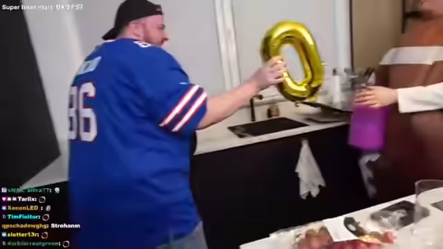 00:26:25Die Streamer unterhalten sich über verschiedene Themen, bevor das Spiel beginnt. Dazu gehören Helium-Gasballons, eine Diskussion über ihre Outfits und die Vorbereitung der Snacks. Sie erwähnen auch ihre Erwartungen an das Spiel und dass einer von ihnen die Kansas City Chiefs unterstützt. Die Stimmung ist locker und humorvoll, mit mehreren albernen Aktionen wie dem Inhalieren von Helium, was zu einer hohen Stimme führt.